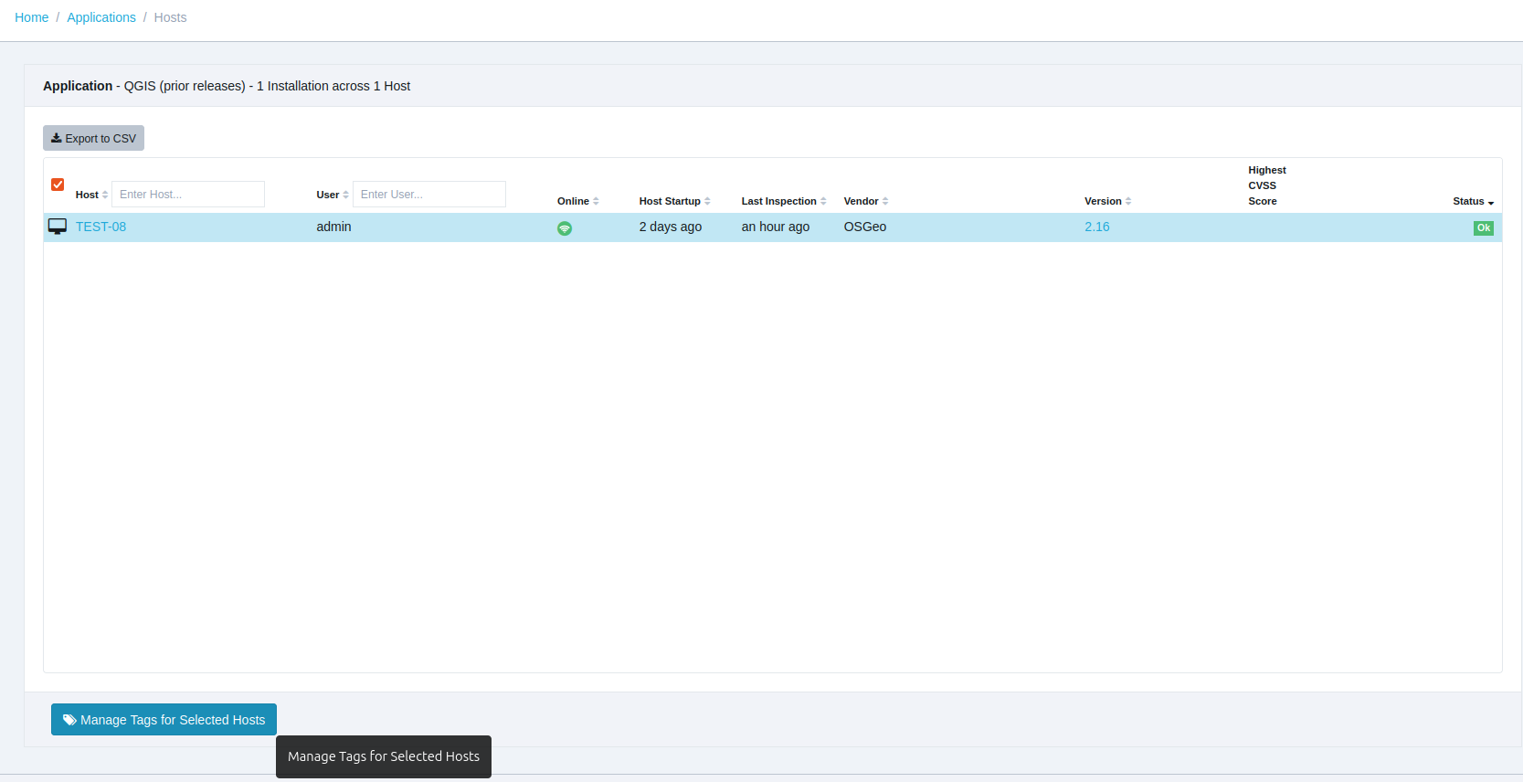 From the Applications page, click on the result under the Installations column to view hosts with QGIS (prior releases) installed and use the
